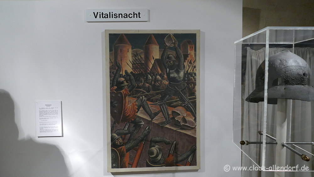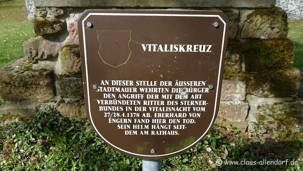Ein unwürdiges Schauspiel hatte die Stiftkirche in der Vitalisnacht, am 28. April 1378 erlebt. In den Anlagen vor den Mauern des Stiftsbezirks erinnert ein